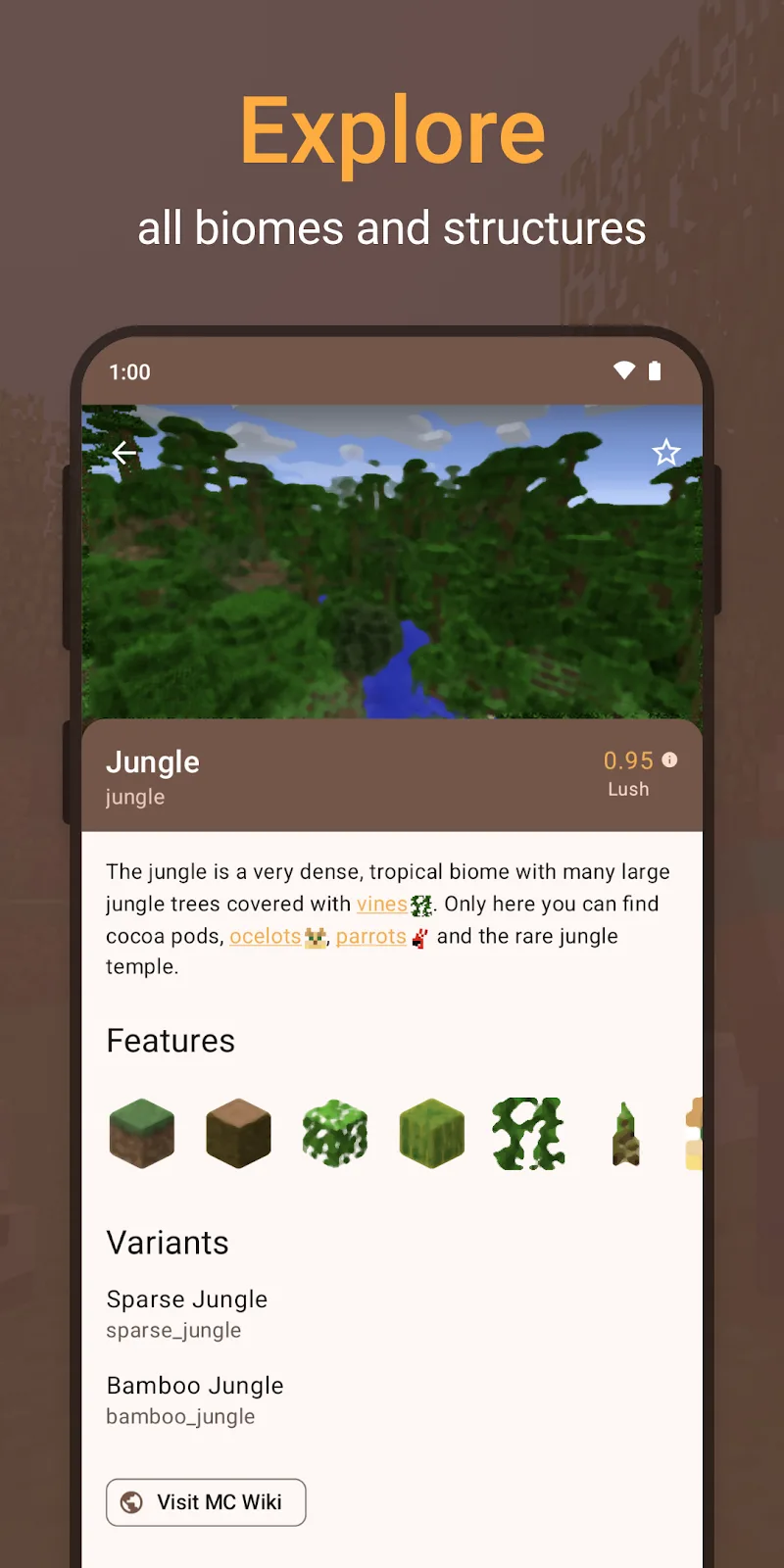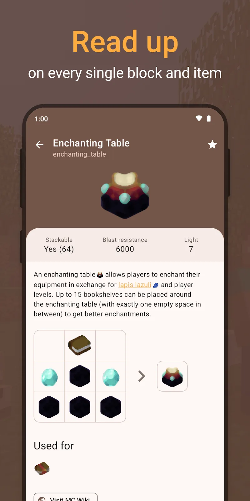 - Detailed information about every block and item: Players can look up complete data about each individual block and item in the game.