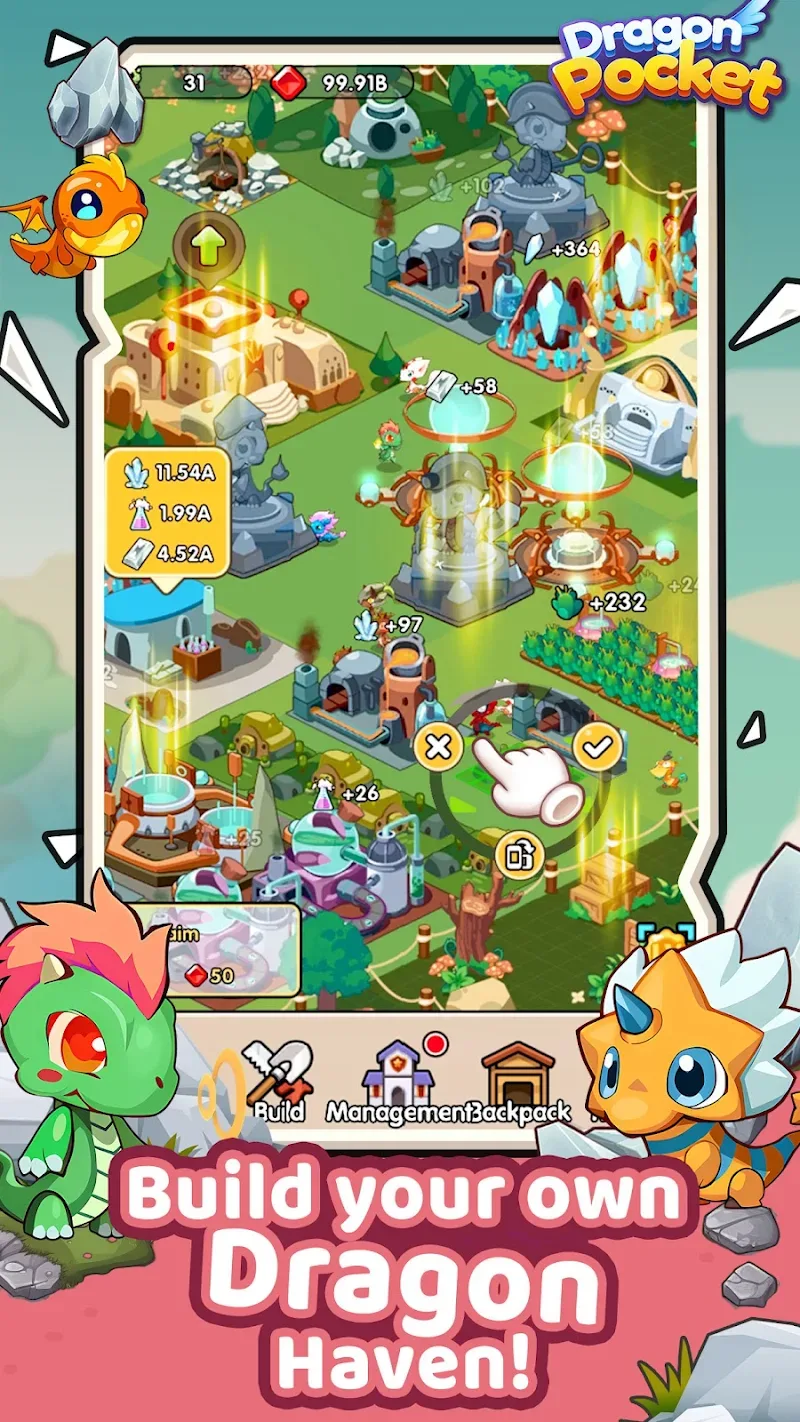 Dragon Pocket tells the story of the world of dragons, where no other creatures exist. Everything exists to serve the dragons. You will play the role of the owner of a farm. There, many species of dragons are allowed to exist together. They will serve the player’s fighting purpose. Above all, you will build yourself a powerful force. In addition, there will also be many forces that are gradually growing beside you. Competition is the most powerful medicine that makes you develop. This game is both a farm game and a resource management game. In addition, players can also combine many different species of dragons to create the strangest creatures possible.