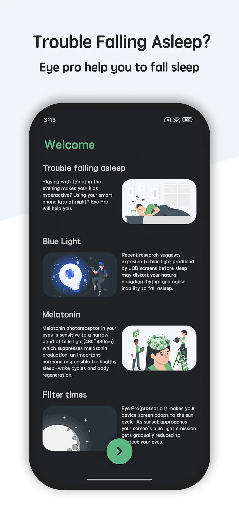 The application aims to support users in improving their body health and eye health. Their eyes will be comprehensively cared for by many layers of protection. Users can also actively block the activity of blue light and protect their sleep. Eye pain, headaches, and insomnia will be significantly improved.