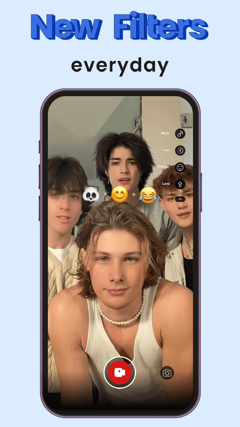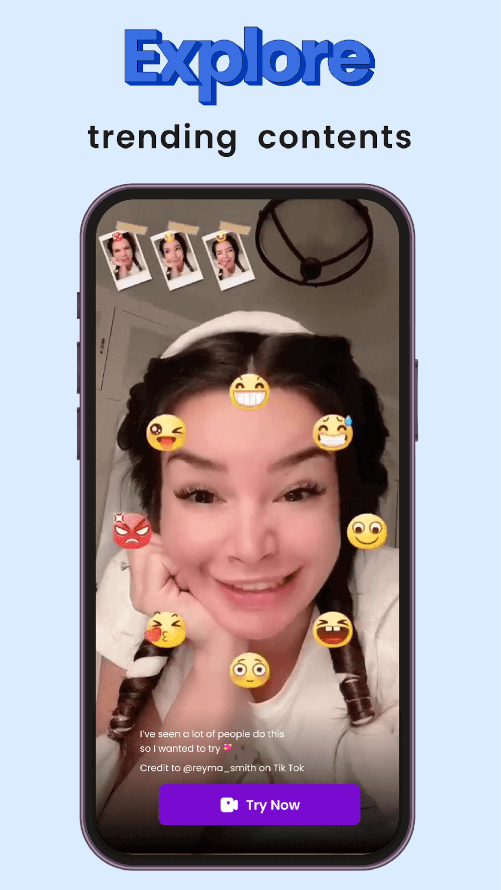 - Social Without Account: Users can experience filming and taking pictures with beautiful emoji templates. Each time they click to record, users will be able to take pictures with new emojis. They will not need to register for an account, but can still use the features of the application.