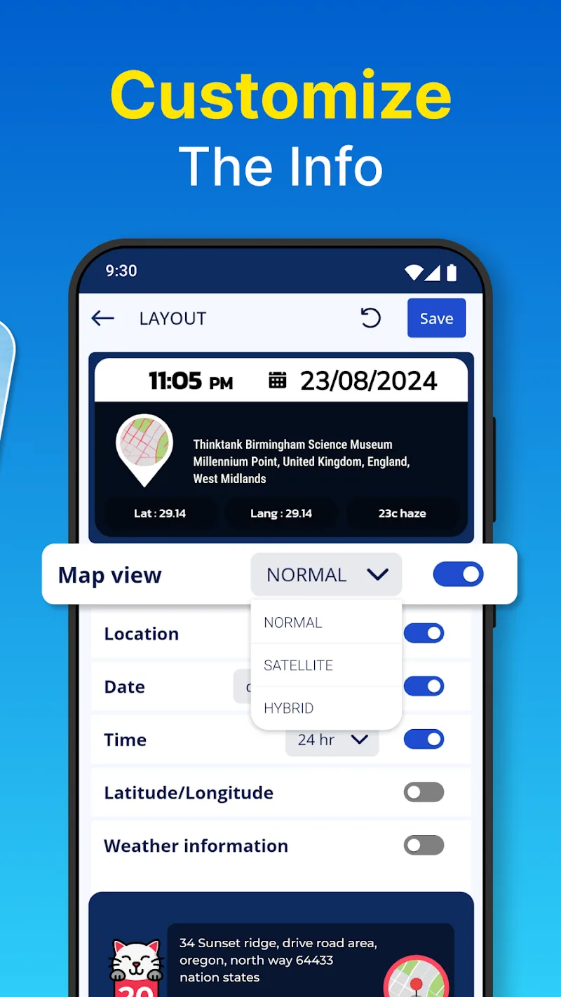 - Custom Layout Views: Photos taken with the GPS camera will display all information related to the location and time of shooting. The application allows users to preview the layout of the photo. Before the photos are saved, the application allows them to edit the location of the location information display.