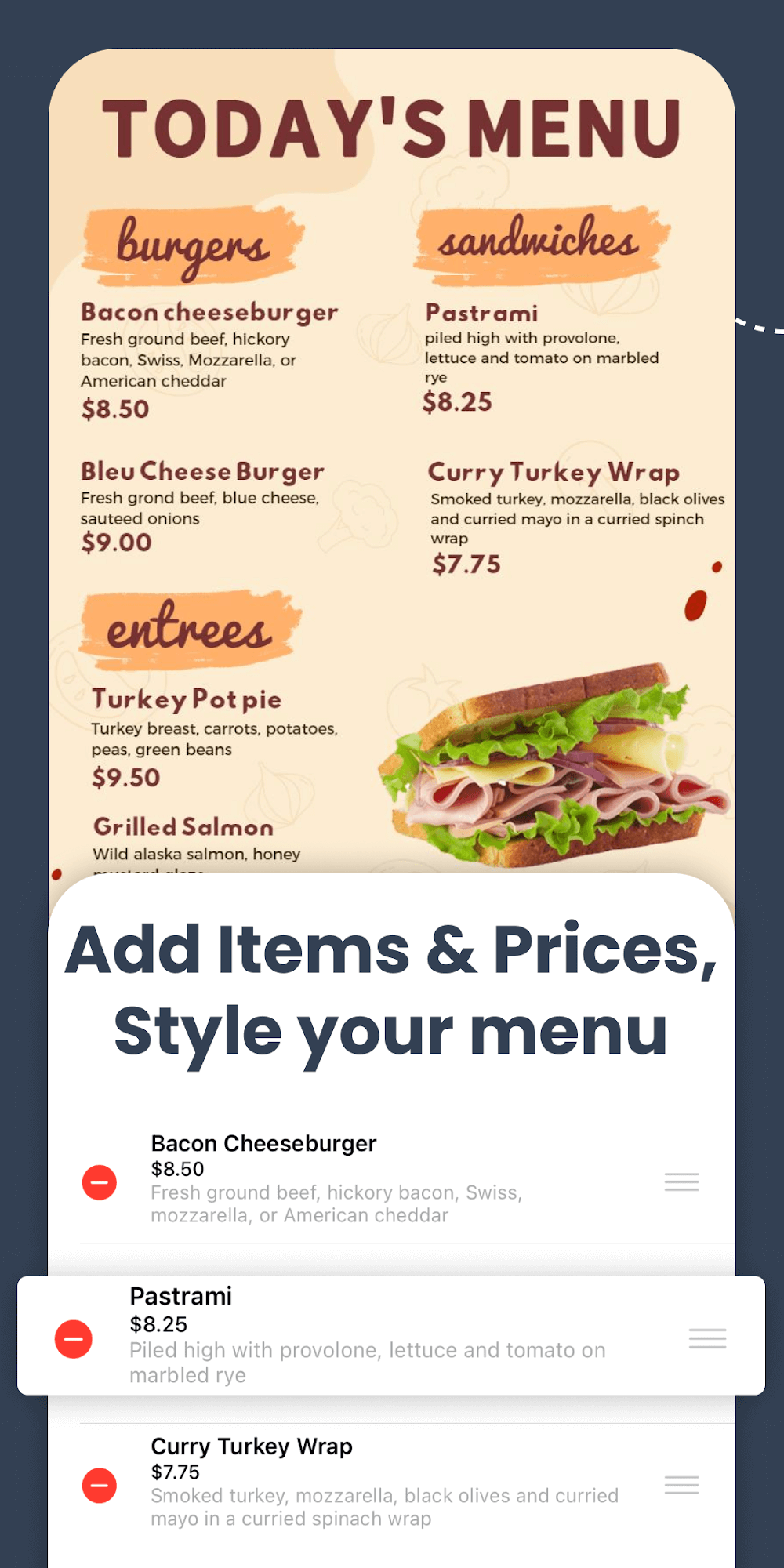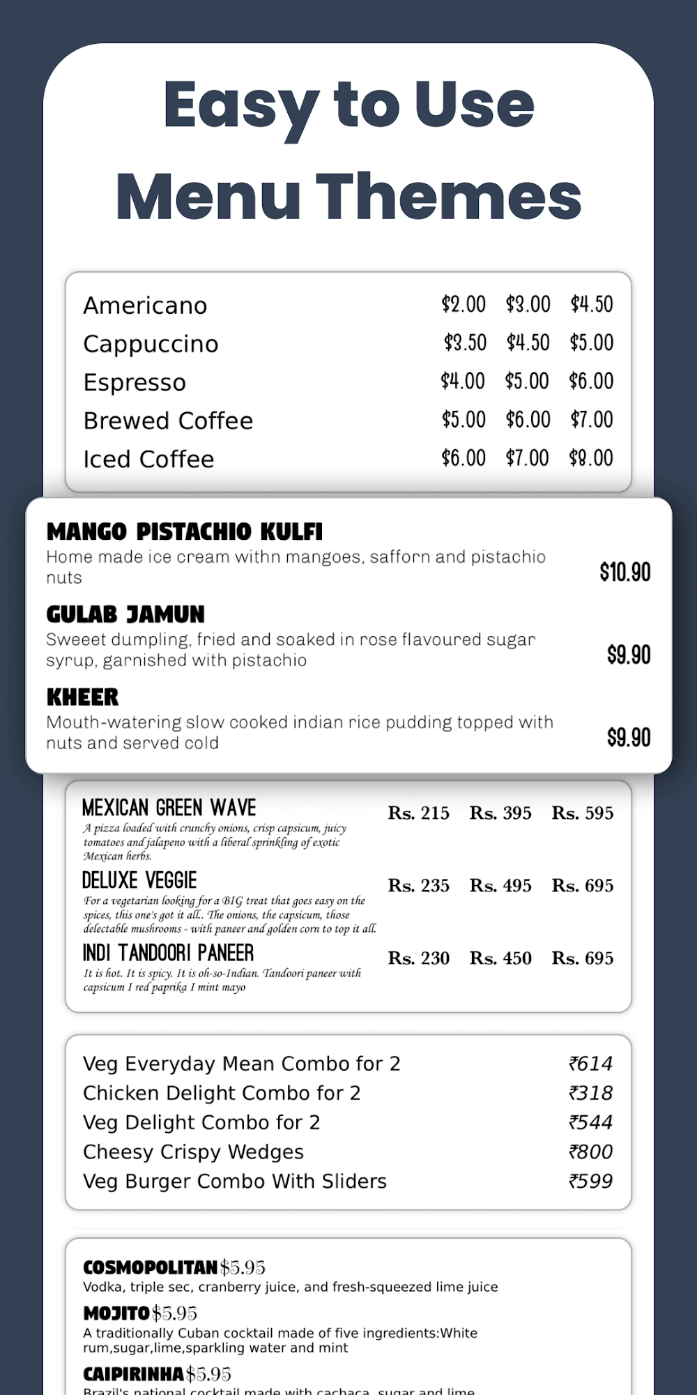 The menu will present all the dishes and drinks served by the restaurant. It plays an important role in the process of building and maintaining the operation of a restaurant. Menu Maker and Menu Templates will provide useful tools to help users create menus without spending much time.