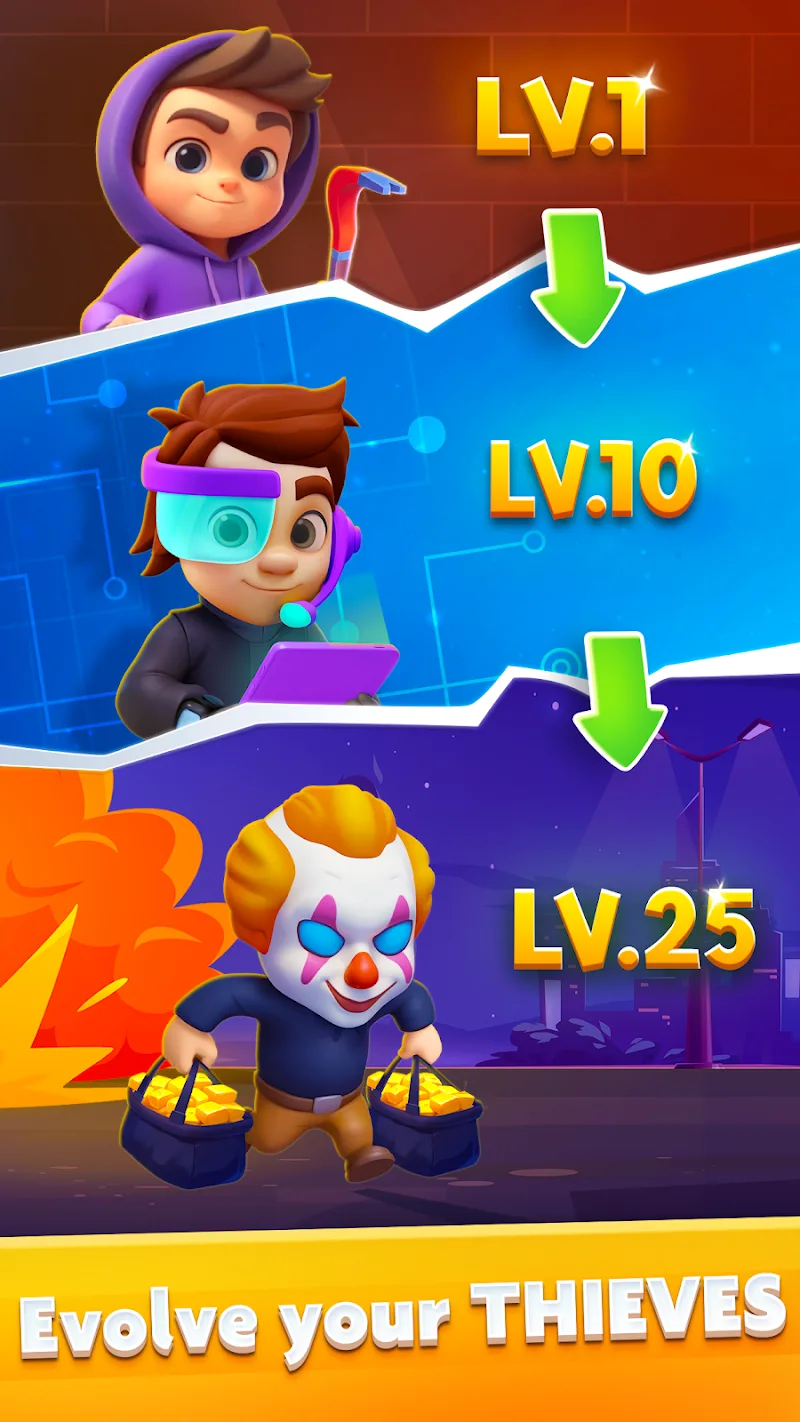 Merge Robbers: Idle Merging is exactly what it sounds like—a fun heist game. You play as a group of thieves aiming to destroy gold safes with different defenses. But the most interesting part is the merging mechanic: you can combine two similar thieves to create a stronger thief. Some safes are extremely durable, requiring up to 12 merges to break through. This game will challenge your strategic skills to arrange and upgrade your team of thieves for maximum efficiency.