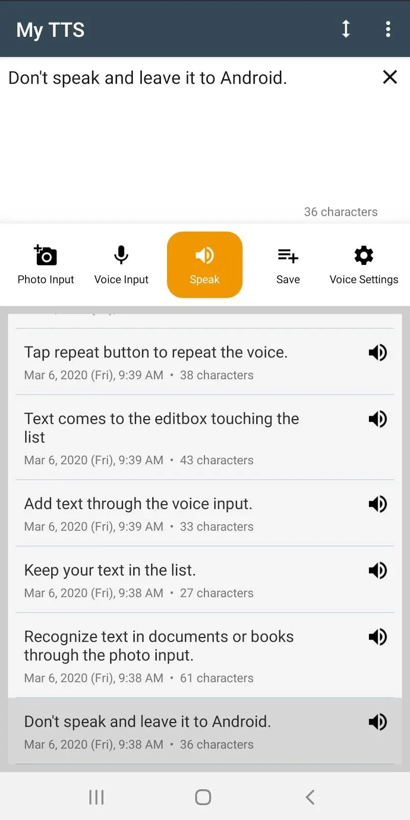 My TTS: Text-to-Speech is an application that can convert text to speech in just a few seconds. The application can convert any sound into text quickly and extremely easily. You will own perfect and accurate texts down to every detail. With this application, you do not need to type manually anymore, but still have the perfect results. Come and experience this convenience.