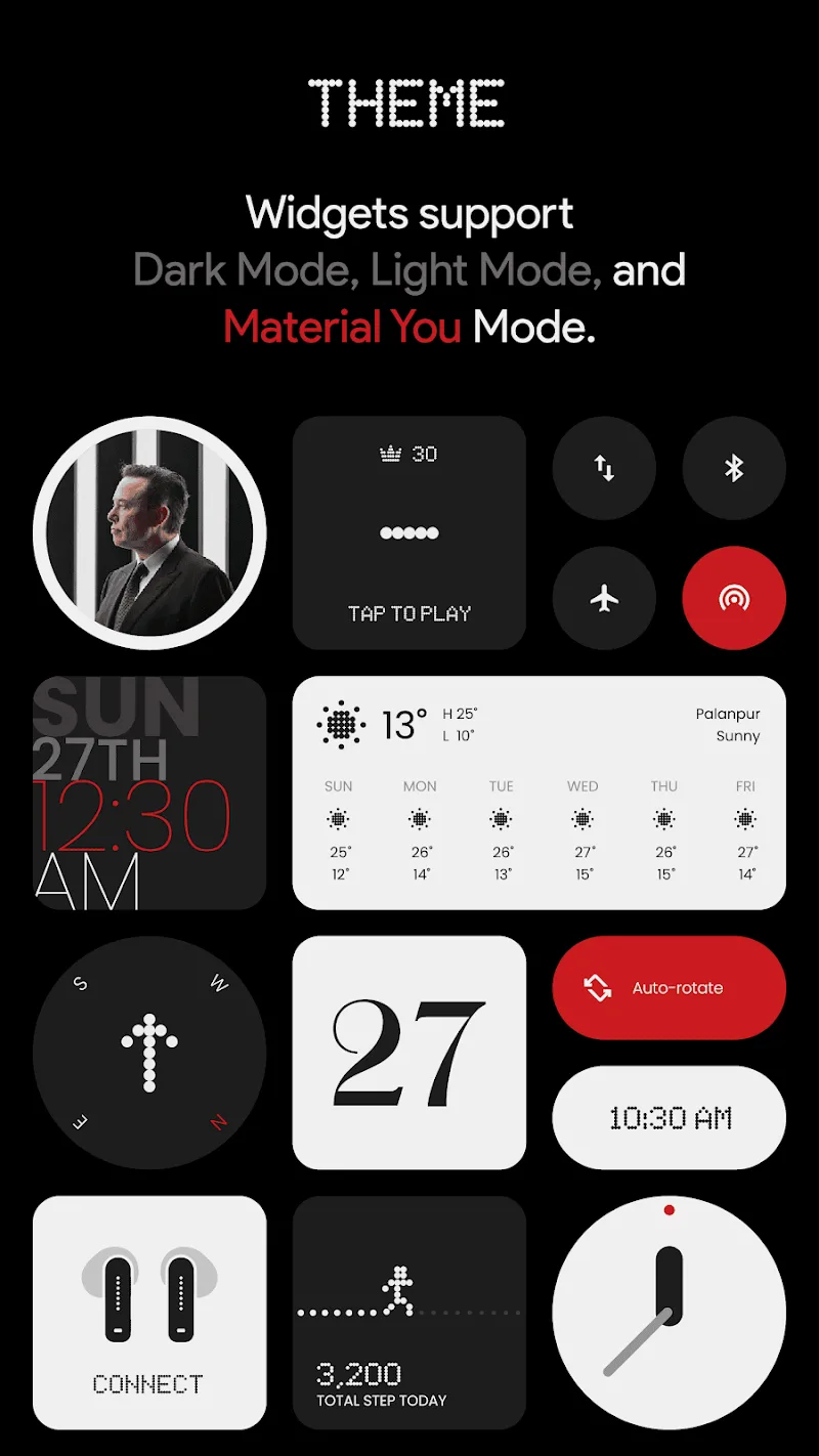 - Theme-Compatible Styles: The application is developed in a minimalist style but still fully displays the necessary widgets. Users can observe unique layouts that save maximum space. The main interface of the device is also decorated with contrasting designs in black, red, and white.