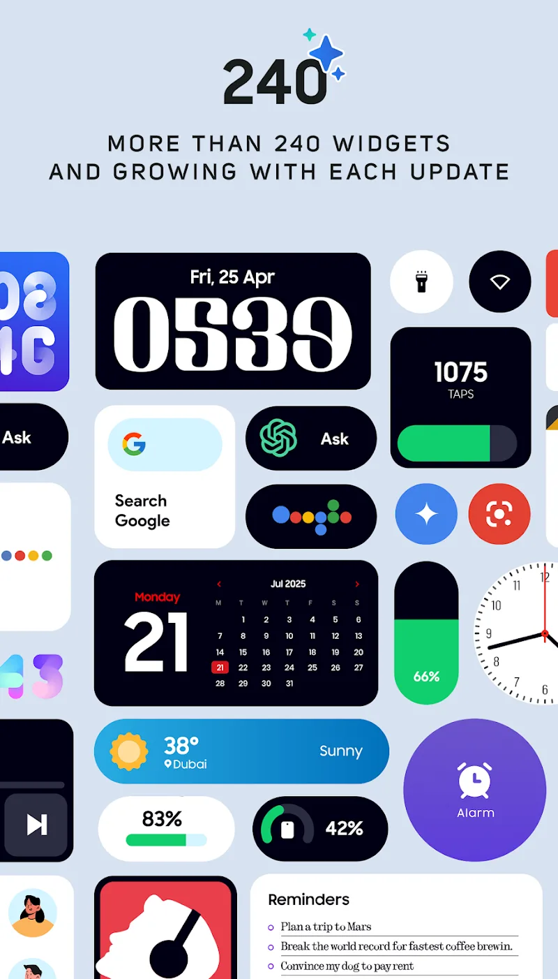 - Over 240 Widgets: With this application, you will have access to 240 unique and rich widgets. Each widget will bring you different designs and styles. Bringing you countless interesting and attractive options.