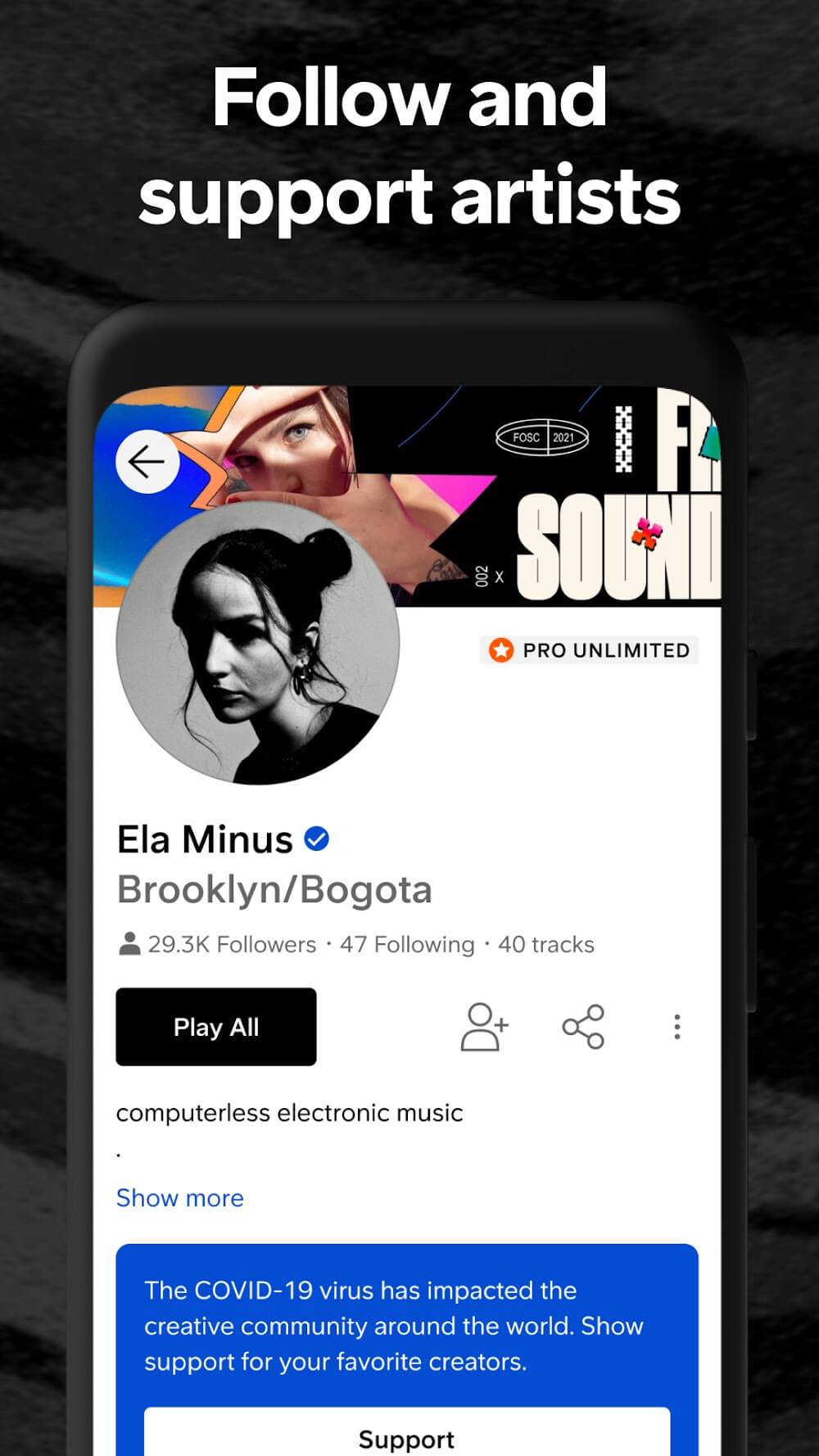 SoundCloud is also a bridge that allows users to follow their favorite artists and connect directly with music fans or discover their playlists. Show your love by simple actions such as liking, reposting and commenting on any song, directly on the music player. Sometimes the action of sharing trending songs and playlists on the app and social networks will also be most welcomed by the large SoundCloud user community.