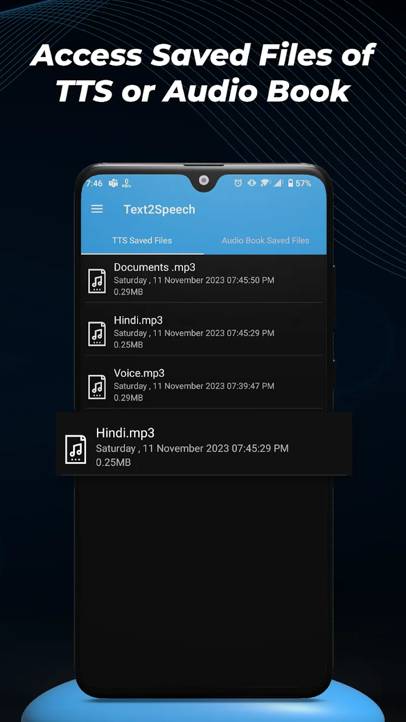 - Convert From Files: Users can convert text directly from any file. They can upload a file with text for the app to process. The final product is a complete audio file.