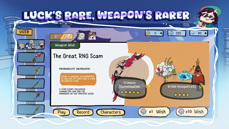 Wacky Wisher is a humorous game, more accurately, a parody of Genshin Impact. For fans of that famous franchise, surely someone has been frustrated with gacha at some point. You can’t win the item you like, right? Even though you’ve spent a lot of resources and effort. You even have to invest money and still can’t get it. So, this game satisfies the players a bit. And the attractive thing here is that it brings a lot of humorous graphics. Distorted humor. In addition, it also provides players with a few mini-games to collect resources for gacha. Haha, after all, it’s a gacha game, right? There has to be a little luck and a little investment of time, right?